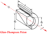 Glan Thompson polarizer is made of two calcite prisms or a -BBO prisms cemented together. Two types of Glan Thompsons are available. One is the standard form and the other is the long form. Their length to aperture ratios are 2.5 : 1 and 3.0 : 1 respectively. Glan Thompsons tend to have higher extinction ratio than air spaced polarizers. In the ultra violet spectrum, their transmission is limited by absorption in birefriengent materials as well as the cement layer. a -BBO polarizers and Calcite polarizers can be used from about 220 to 900nm and 350 to 2300 nm respectively.